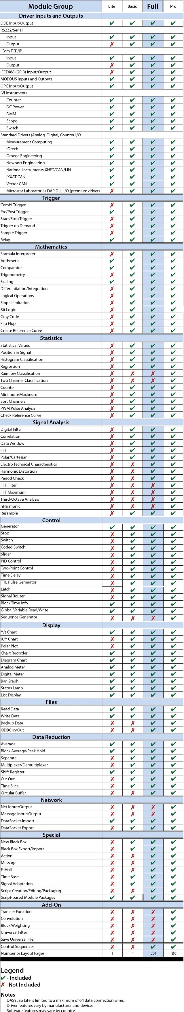 DASYLab pour l'acquisition, l'automatisation et l'analyse. DASYLab Full comprend presque tous les modules, y compris les modules d'analyse du signal. Le module d'action permet l'automatisation et le contrôle étendu de vos mesures. Le séquenceur de commande vous permet de créer une collection coordonnée de tests. Jusqu'à 200 pages de présentation permettent une large gamme d'interfaces utilisateurs et de rapports sur mesure. Cette version comprend l'action, ODBC, buffer circulaire, les modules message et e-mail. Les modules additionnels sont possibles avec cette version. La version peut être mise à niveau vers Pro. | |