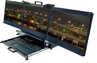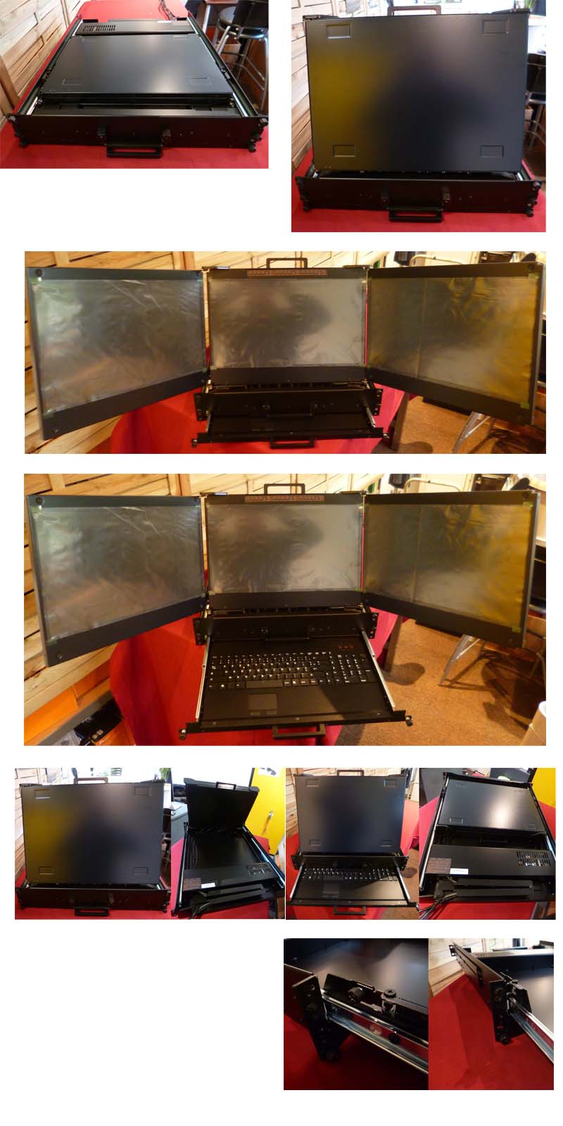 SAIS propose son modèle DKM HD en version triple écran LCD 17.3 " HD 1920x1080. Alimentation secteur, interfaces graphiques 2 DVI / DP . Clavier / touchpad sont compatibles USB ou PS/2. Tarif indicatif 3495€ HT. double rail. | |