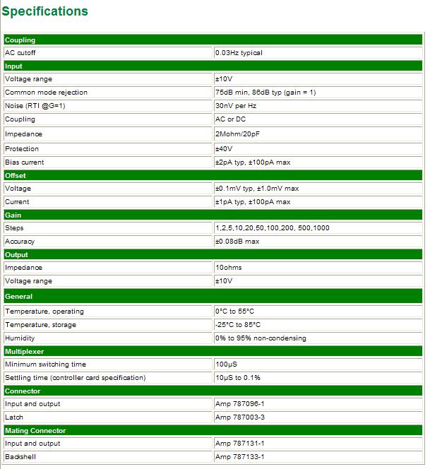 8 Ampli & filtres par module. Caractéristiques du filtre sélectionable par logiciel 4-pôle Butterworth. Couplage du signal AC ou DC. Selection de la fréquence de coupure voie par voie et amplificateur différentiel x1, x2, x5, x10, x20, x50, x100, x500 et x1000. La fréquence de coupure est réglée en continu, la bande passante en Butterworth est comprise entre 0,5 Hz et 70 kHz. Horloges programmables, entrées & sorties ± 10V. | |