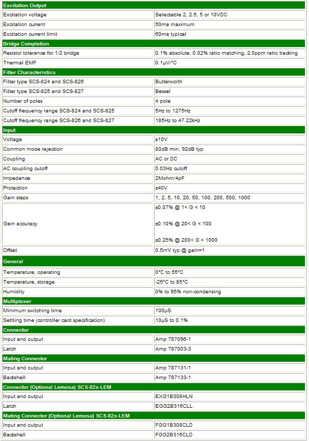 4 Ampli & filtres par module. Caractéristiques du filtre sélectionable par logiciel 4-pôle Bessel. La fréquence de coupure est réglée en continu entre 5 Hz et 1275 Hz ( SCS-824 ) et de 185 Hz à 47,22 kHz ( SCS-826). 4 entrées pour jauges de contraintes, du simple élément 1/4 pont à 4 éléments pont-complet. 4 tensions d'excitation 2, 2.5, 5 et 10 volts. Connexion Kelvin, limite de courant @ 60 mA. Gain de 1 à 1000 par pas 1-2-5. Horloges programmables, entrées & sorties ± 10V. Couplage AC & DC. Compensation d'offset automatique permettant de se passer de la procédure de calibration. | |